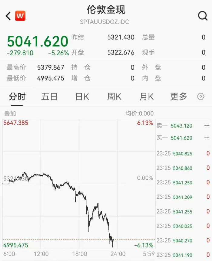 现货金银持续下跌,现货黄金一度向下跌破5000美元,日内跌超6%;现货白银报79.63美元/盎司,跌幅超过10%。
