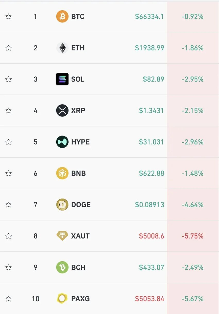加密货币多数币种下跌,比特币跌幅0.92%,报66334美元/枚。