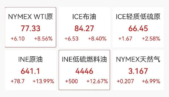 国际油价持续拉升,WTI原油、布伦特原油双双大涨8%,布伦特原油报每桶84.27美元,创2024年7月以来新高。